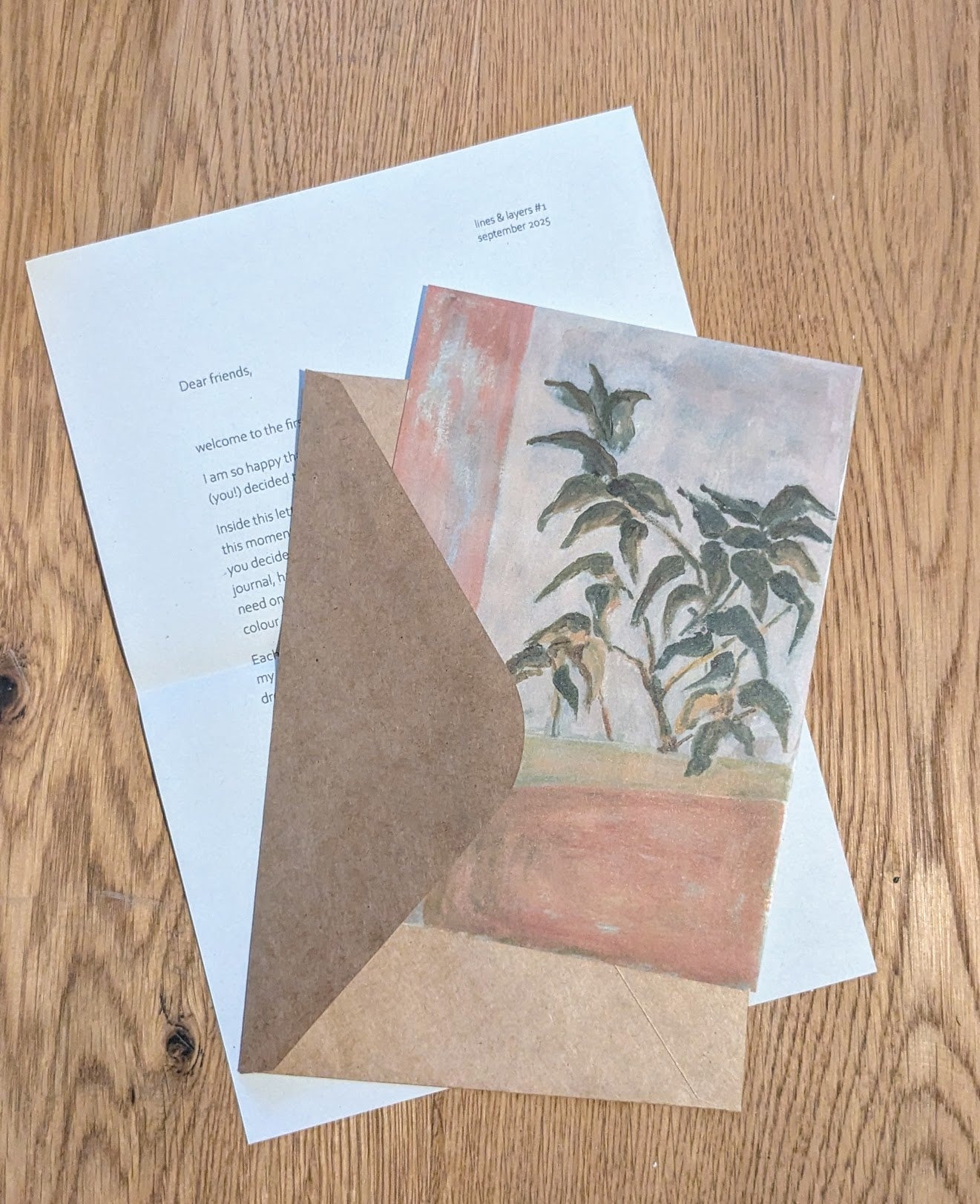 Join my print club lines & layers and receive a carefully chosen postcard-sized art print from my studio. Printed with love, wrapped with care and accompanied by a small note or story behind the piece.
